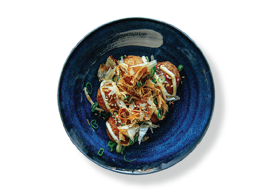 Bouchées gaufrées à la pieuvre, flocons bonites servis avec sauce Tonkatsu et mayonnaise